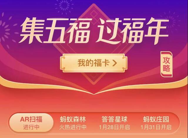 1月25日起,在手機中打開支付寶APP,在首頁醒目位置就可以看到“五福到 新年到”活動入口,點擊進入就可以看到集五福,過福年活動攻略頁面。