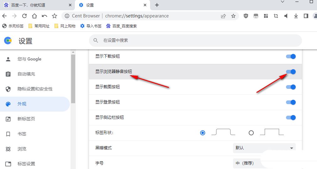 4、進入“外觀”選項的頁面之后,我們在該頁面中找到“顯示瀏覽器靜音按鈕”選項,將該選項右側的開關按鈕打開