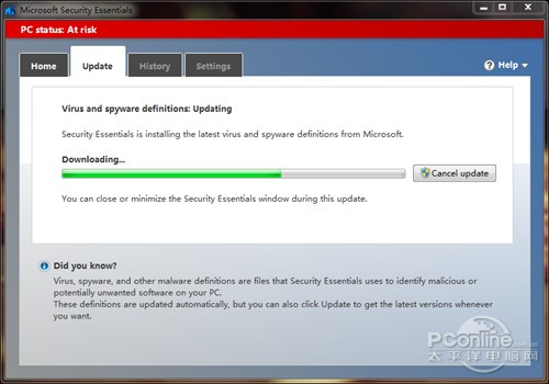 安裝完畢會首先進(jìn)入更新檢查,這已經(jīng)是 MSE 的老傳統(tǒng)了,目的是下載一個完整的病毒庫。從筆者的實(shí)測情況來看,速度依舊不夠給力(電信 4M ADSL),整個過程中基本維持在 60Kbps 左右,而且并不平穩(wěn),大約過了 20 分鐘更新才告結(jié)束。最終,更新后的程序版本為 4.0.1111.0。