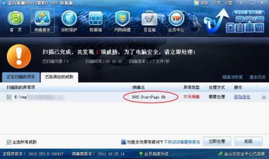 圖2 金山毒霸查殺穿越者DOS病毒