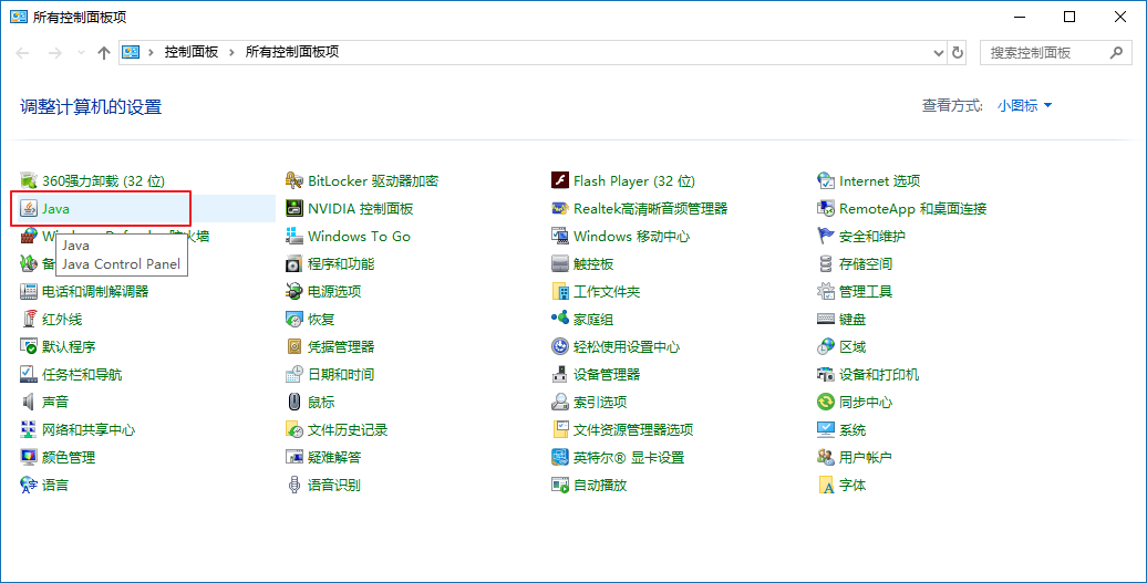 2、找到控制面板,查看方式選擇大圖標或者小圖標,找到 java選項并點擊進入(注意:該java選項只有在獨立安裝了jre后才有)。