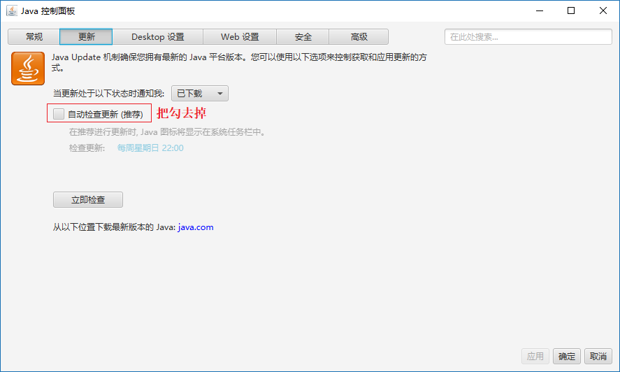 選擇更新按鈕,去掉自動檢查更新,不要自動更新。(同樣是獨立安裝jre-9以后才有如下的界面)