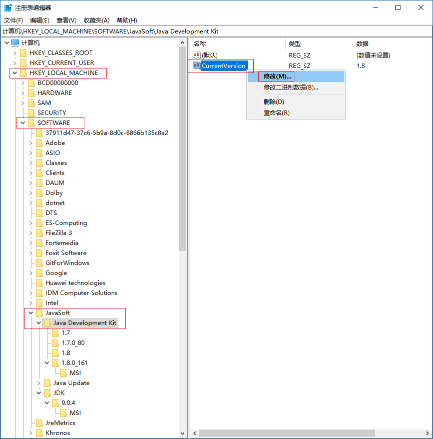 點擊Java Development Kit更改右邊CurrentVersion的值設置為你想要的版本值(右鍵 --> 更改就可以)。