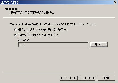 10.選擇將證書放入“個(gè)人”存儲(chǔ)區(qū),點(diǎn)擊“下一步”,再選擇“完成”,則證書已經(jīng)導(dǎo)入服務(wù)器。