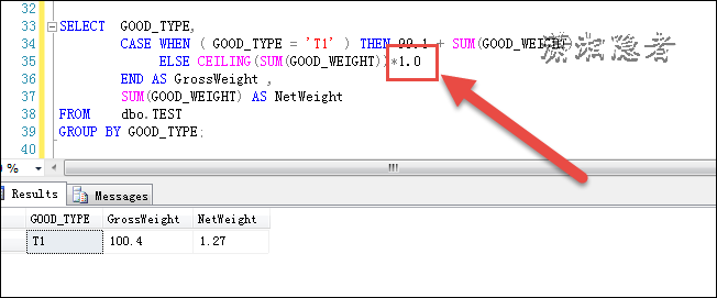 如上所示,為什么99.1 + SUM(GOOD_WEIGHT)變成100了呢? 原始SQL非常復雜,我們分析、排除掉各個因素后,始終不得要領,各種折騰中發現,如果這樣轉換一下(請見下面截圖),居然就OK了,后面分析了一下,應該是CASE WHEN里面的不同數據類型導致隱式轉換,說實話之前還真沒有留意CASE WHEN中存在數據類型的隱性轉換,但是為什么就一定從NUMERIC轉換為INT了呢? 而不是INT隱性轉換為NUMERIC呢, 說實話沒有看到相關文檔的官方,如果按照官方文檔:
