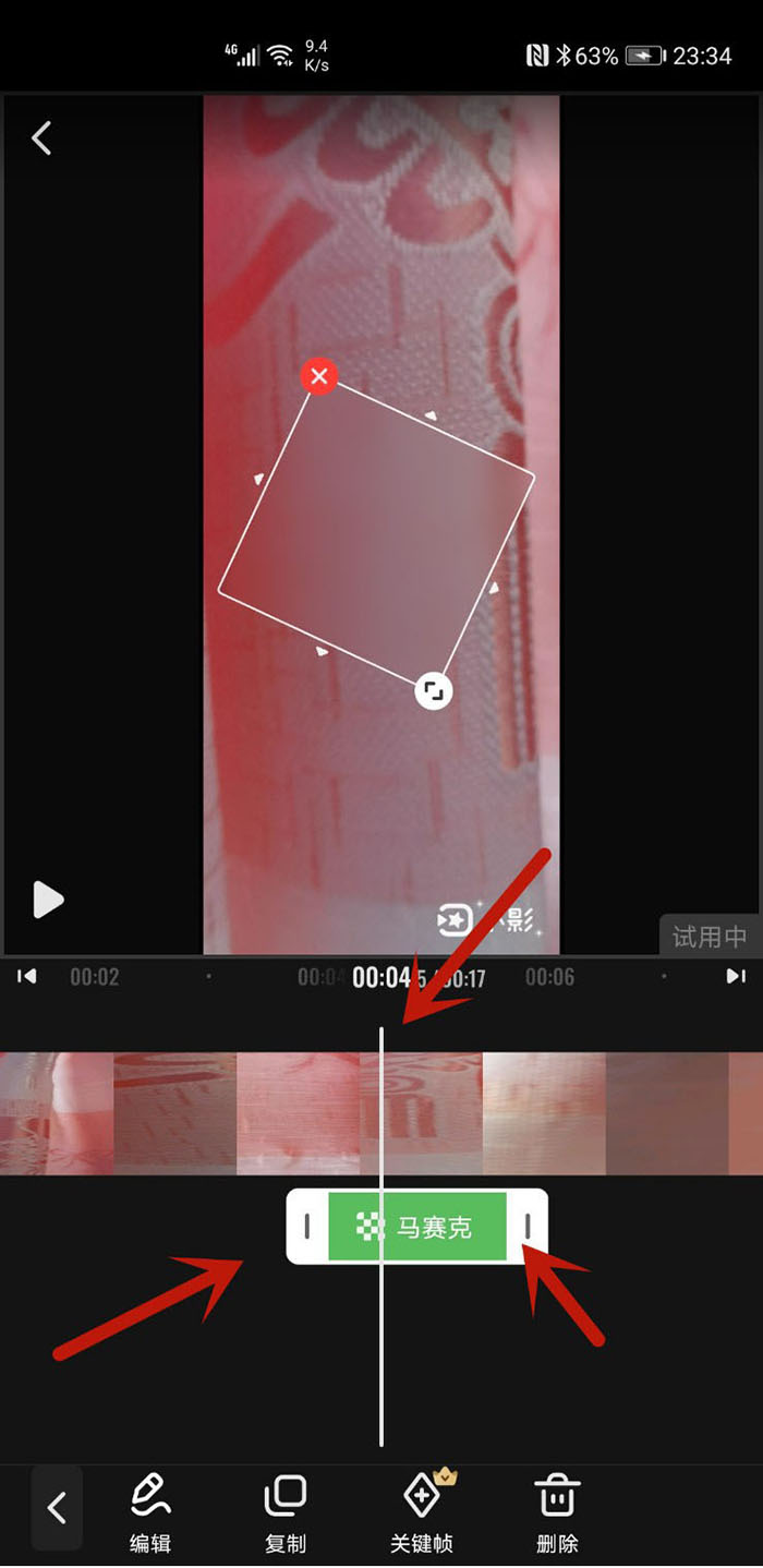 6、然后視頻出現(xiàn)虛化效果馬賽克的框,拖動選擇虛化的位置和大小。