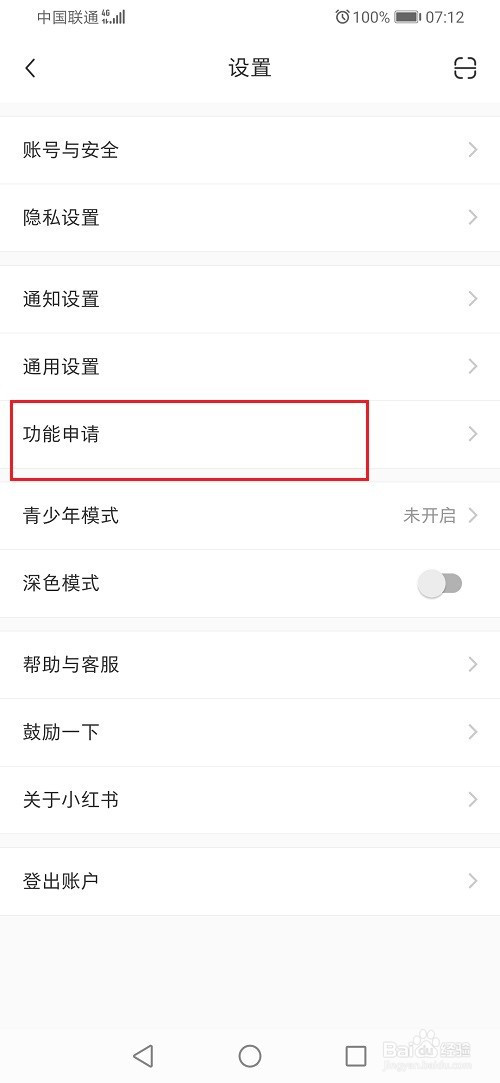 第二步進去小紅書設(shè)置之后,點擊功能申請,如下圖所示: