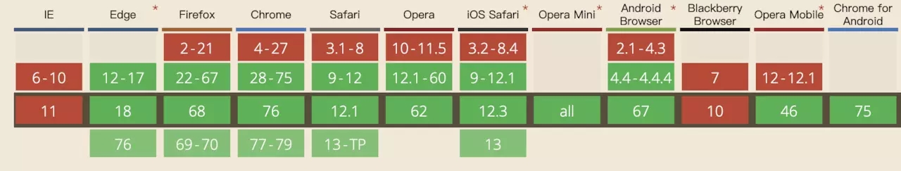 每個CSS特性使用最后都離不開談兼容性。特性查詢是在2011年就已經發布的草案,多年來支持程度已經比較可觀了,除了IE系列全軍覆沒之外,其他主流瀏覽器都能夠很好的支持。